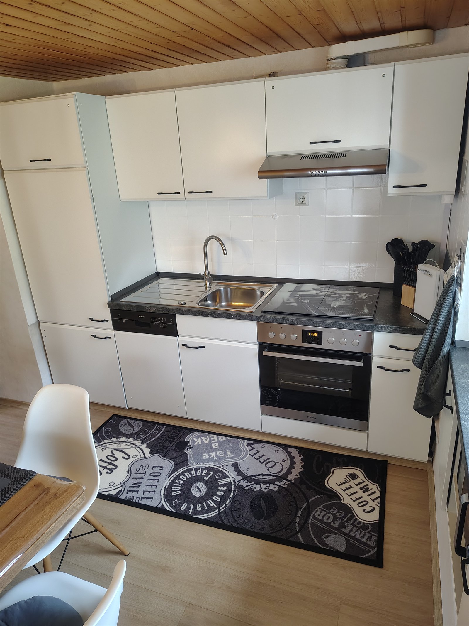 Die Küche ist mit Geschirrspüler, Backofen, Ceranfeld, Mikrowelle, Kühlschrank mit kleinem Gefrierfach, Kaffeemaschine, Wasserkocher, Toaster, Eierkocher sowie Geschirr und Besteck ausgestattet. Ein Hochstuhl, Spiele für Kinder und Brettspiele sind ebenfalls vorhanden.
